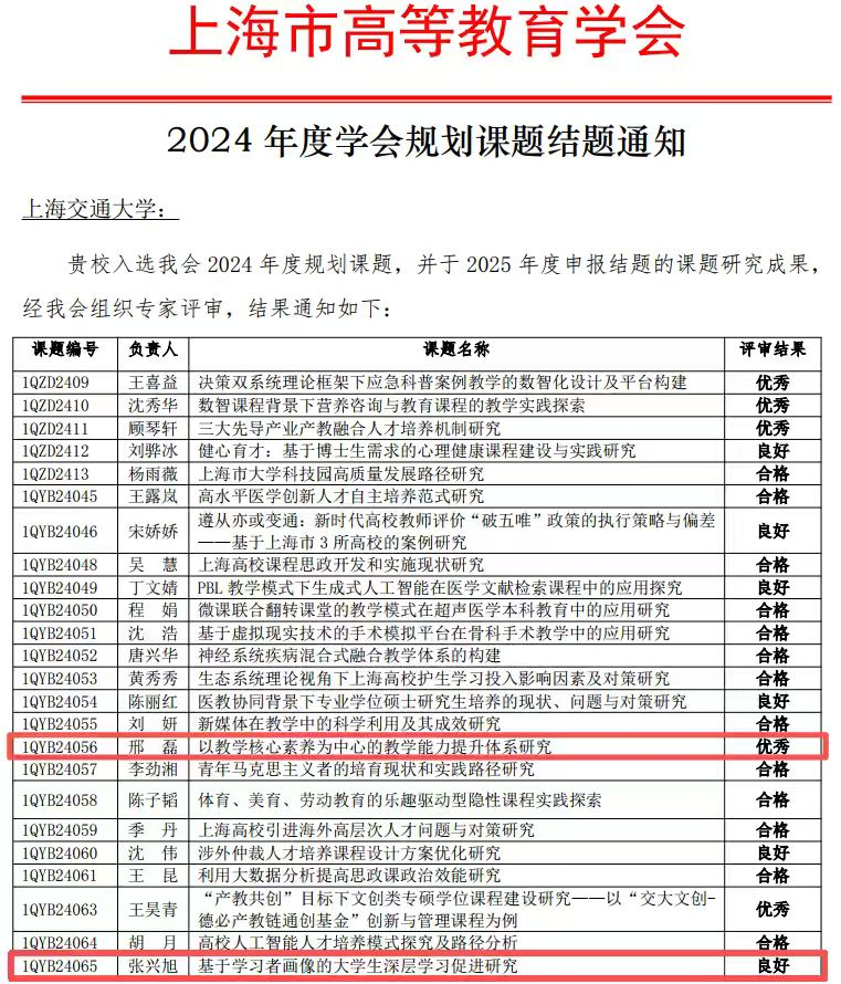 近日,上海市高等教育学会2024年度学会规划课题评审结果揭晓,上海交通大学教学发展中心两项课题均顺利结题。其中,邢磊主持的《以教学核心素养为中心的教学能力提升体系研究》获评“优秀”、张兴旭主持的《基于学习者画像的大学生深层学习促进研究》获评“良好”。