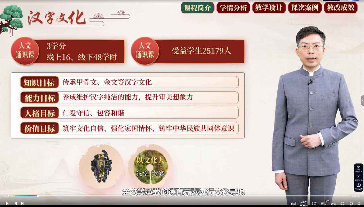 刘元春老师的“汉字文化”课程是我校人文通识优质课程。课程通过讲述甲骨文、金文等汉字及其承载的文化现象,着力于培养本科生对母语文字的热爱,提升人文素养,筑牢优秀传统文化根基。课程自2018年以来积极探索混合式教学改革与实践,先后获得5项校级教改项目,出版校级优秀教材及工具书3部。课程创新地提出了“四文一体”的教学设计主线,并成功入选学校首批“HI导师+AI教师”课堂变革计划。课程被认定为上海市一流本科课程、重点课程、课程思政示范课程和新华思政示范课程等。